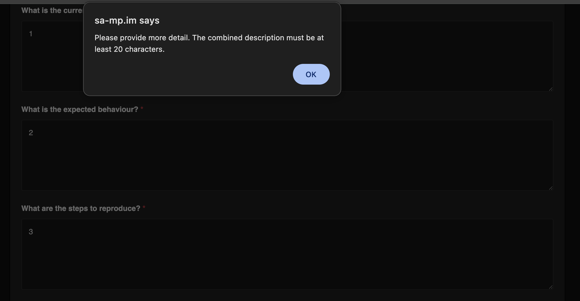 basically right now, you report and issue without having max/min characters and you end up losing all text saved when you submit.